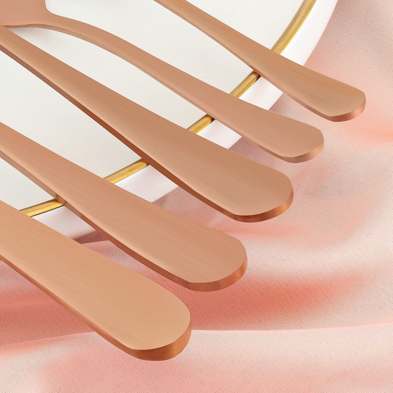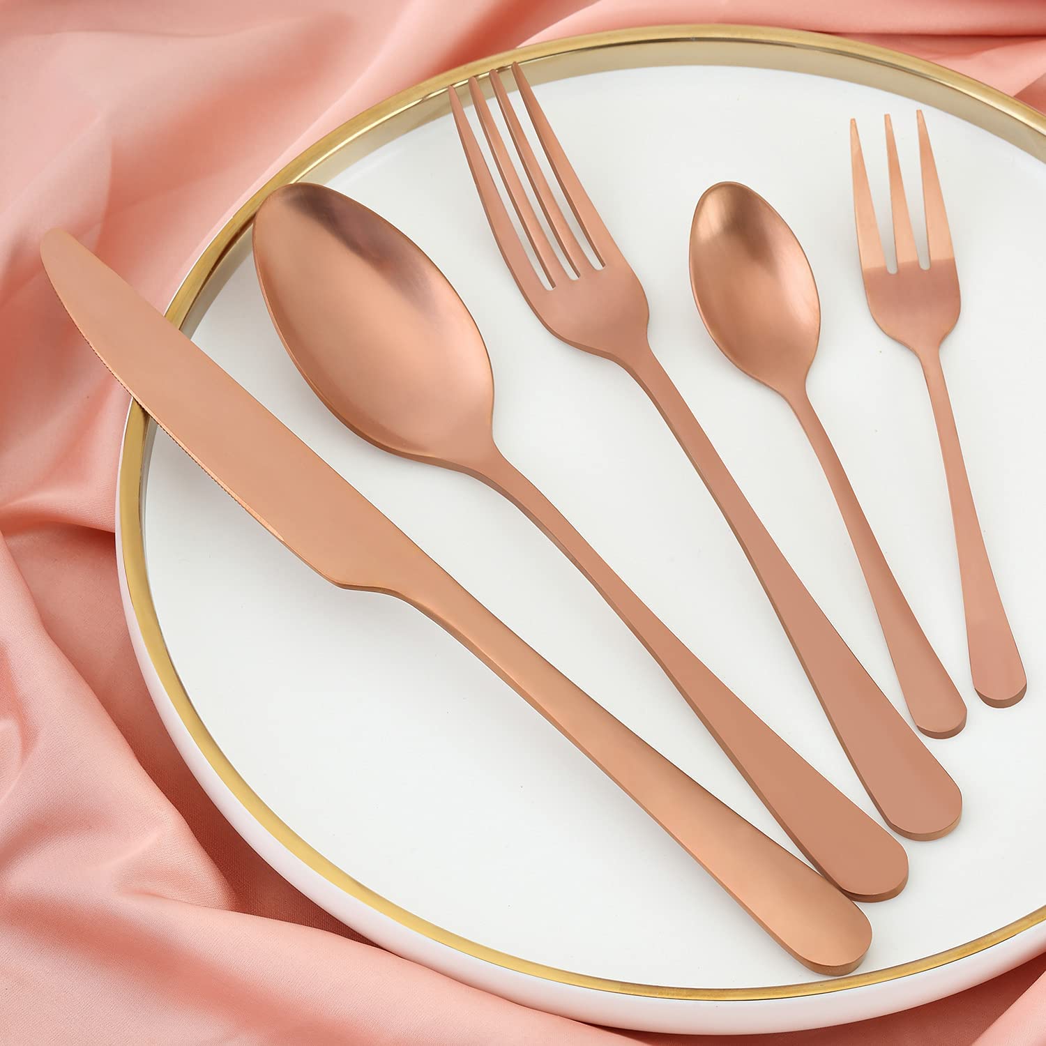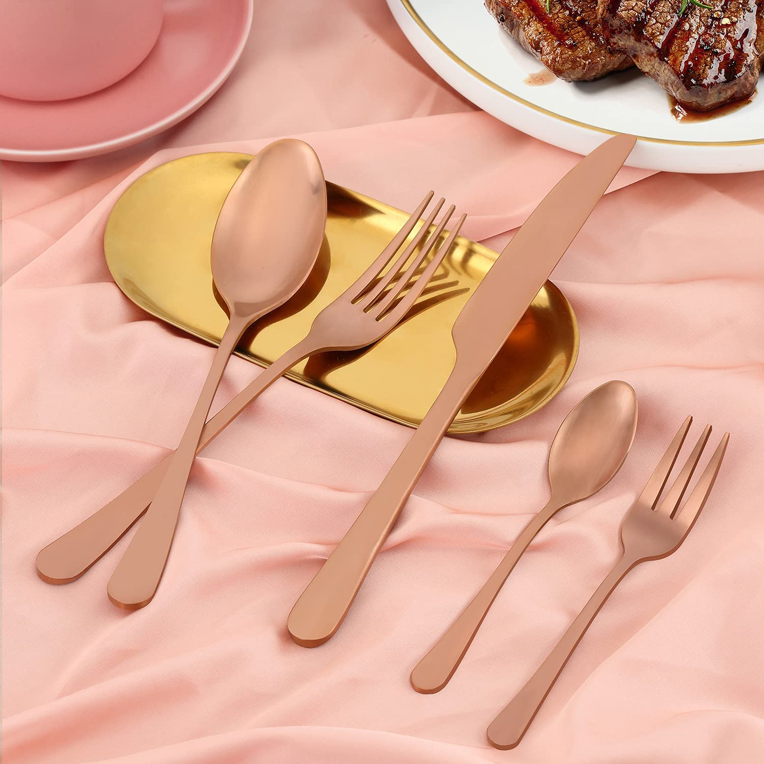 Komplet eleganckich sztućców w kolorze różowego złota w wykończeniu matowym. Wyprodukowany ze stali szlachetnej odpornej na rdze, próżniowo powlekane złotem. Zestawu można używać na specjalne okazje ale też do codziennego użytkowania. Sztućce nadają się do mycia w zmywarce w 30 stopniach Celsjusza.