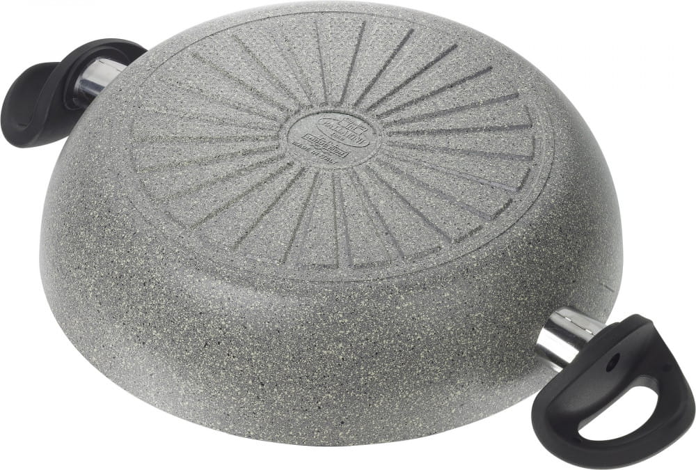 Patelnia Ferrara pozwoli na przygotowanie delikatnych smażonych i duszonych dań. Posiada stalowo aluminiowe podwójne dno co gwarantuje szybkie oraz równomierne nagrzewanie naczynia. Posiada 5-warstwową powłokę nieprzywierającą Granitium Extreme. Powłoka ta zapobiega przywieraniu jak również chroni przed zadrapaniami i pęknięciami na dnie naczynia. Stosowanie metalowych przyborów kuchennych nie stanowi zatem problemu. Uchwyty z tworzywa sztucznego ułatwiają przenoszenie oraz serwowanie przygotowanych potraw. Dodatkowa ochrona przed płomieniem oraz śruba ze stali nierdzewnej izolują uchwyty i chronią przed nagrzaniem. Czyszczenie ułatwi mozliwość mycia w zmywarce.
