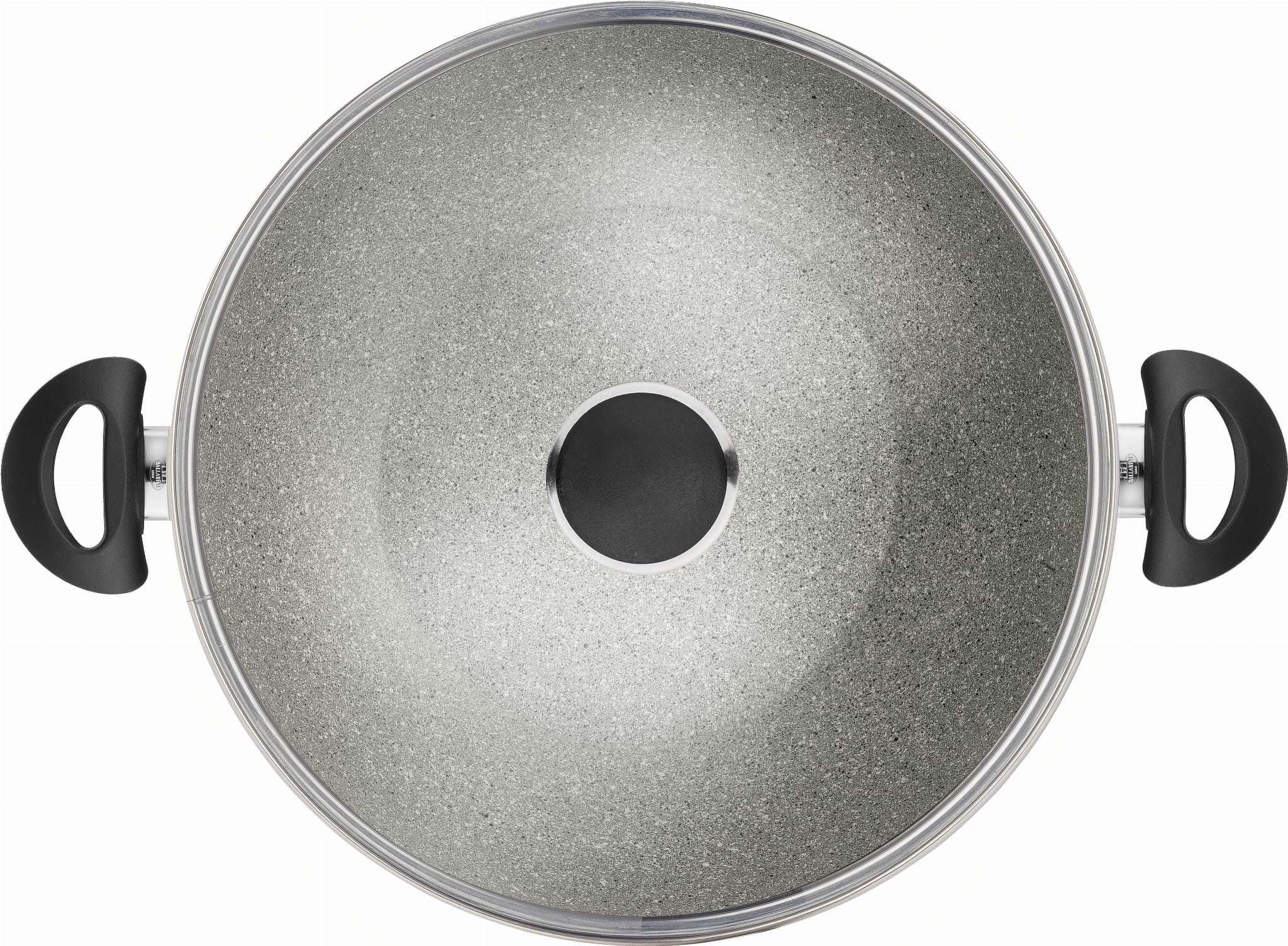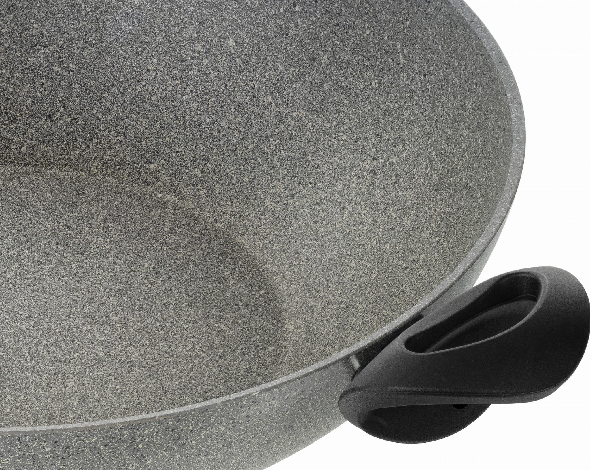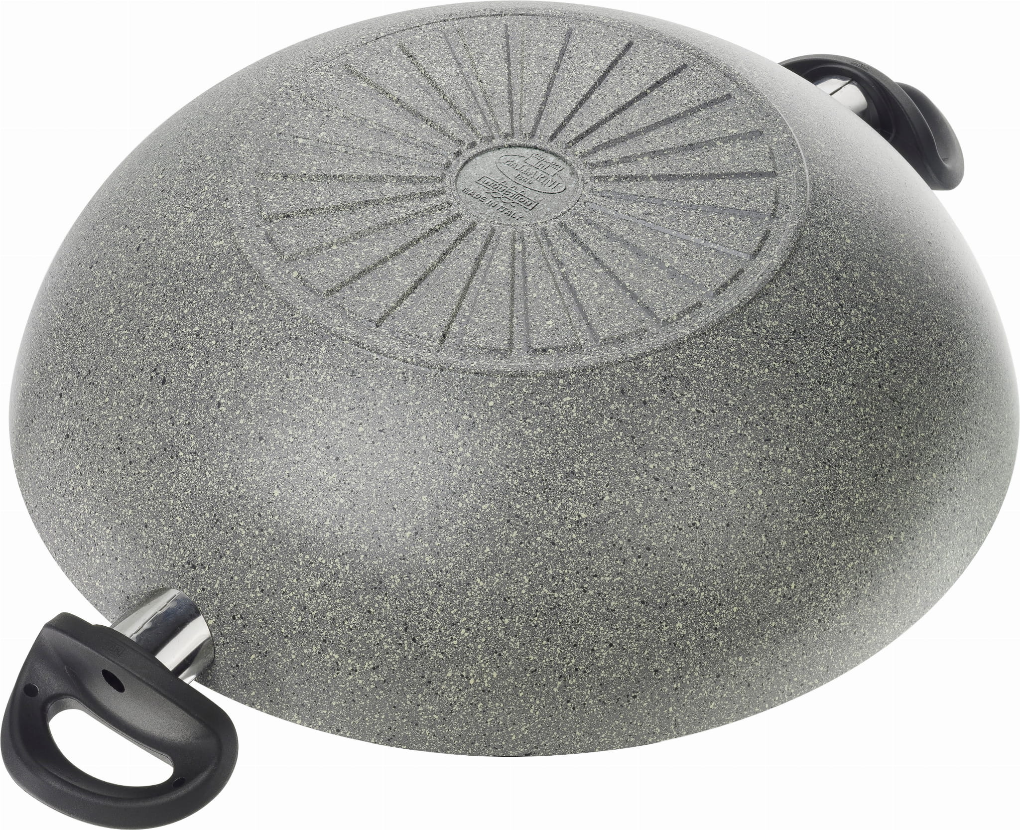 Wok Ferrara pozwoli na przygotowanie dań kuchni azjatyckiej. Posiada stalowo aluminiowe podwójne dno co gwarantuje szybkie oraz równomierne nagrzewanie naczynia. Posiada 5-warstwową powłokę nieprzywierającą Granitium Extreme. Powłoka ta zapobiega przywieraniu jak również chroni przed zadrapaniami i pęknięciami na dnie naczynia. Stosowanie metalowych przyborów kuchennych nie stanowi zatem problemu. Uchwyty z tworzywa sztucznego ułatwiają przenoszenie oraz serwowanie przygotowanych potraw. Dodatkowa ochrona przed płomieniem oraz śruba ze stali nierdzewnej izolują uchwyty i chronią przed nagrzaniem. Czyszczenie ułatwi mozliwość mycia w zmywarce.