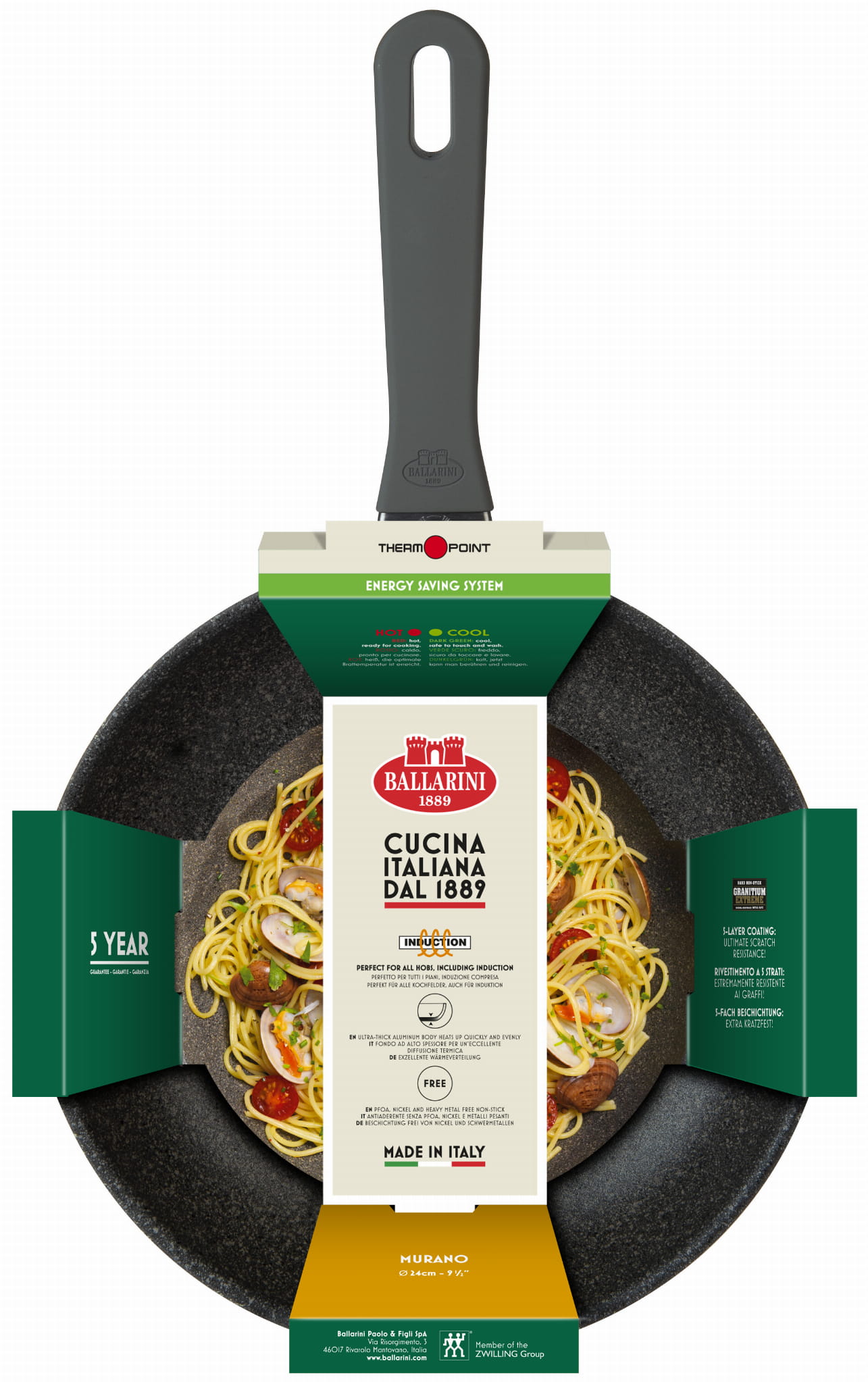 Patelnia Ballarini Murano została w całości wyprodukowa i zaprojektowana we Włoszech. Za projekt odpowiada Studio Matteo Thun & Antonio Rodriguez z Mediolanu. Wykonana została z litego, kutego aluminium co gwarantuje szybkie oraz równomierne nagrzewanie naczynia. Patelnia nadaje się na wszystkie rodzaje kuchenek w tym również na indukcję. Dodatkowo posiada 5-warstwową powłokę nieprzywierającą GRANITUM Extreme. Powłoka ta zapobiega przywieraniu jak również chroni przed zadrapaniami i pęknięciami na dnie naczynia. Uchwyt z tworzywa sztucznego wyposażony jest w praktyczny termopunkt, który informuje kiedy można rozpocząć smażenie, a także kiedy patelnia ostygnie, aby ją wyczyścić. Czyszczenie ułatwi mozliwość mycia w zmywarce, jednak dla zagwarantowania wyjątkowej trwałości zalecane jest mycie ręczne.