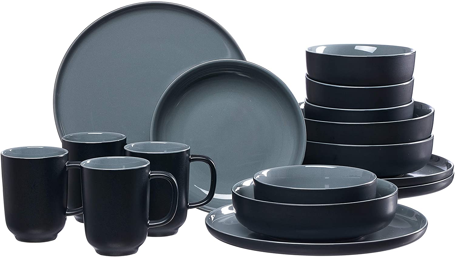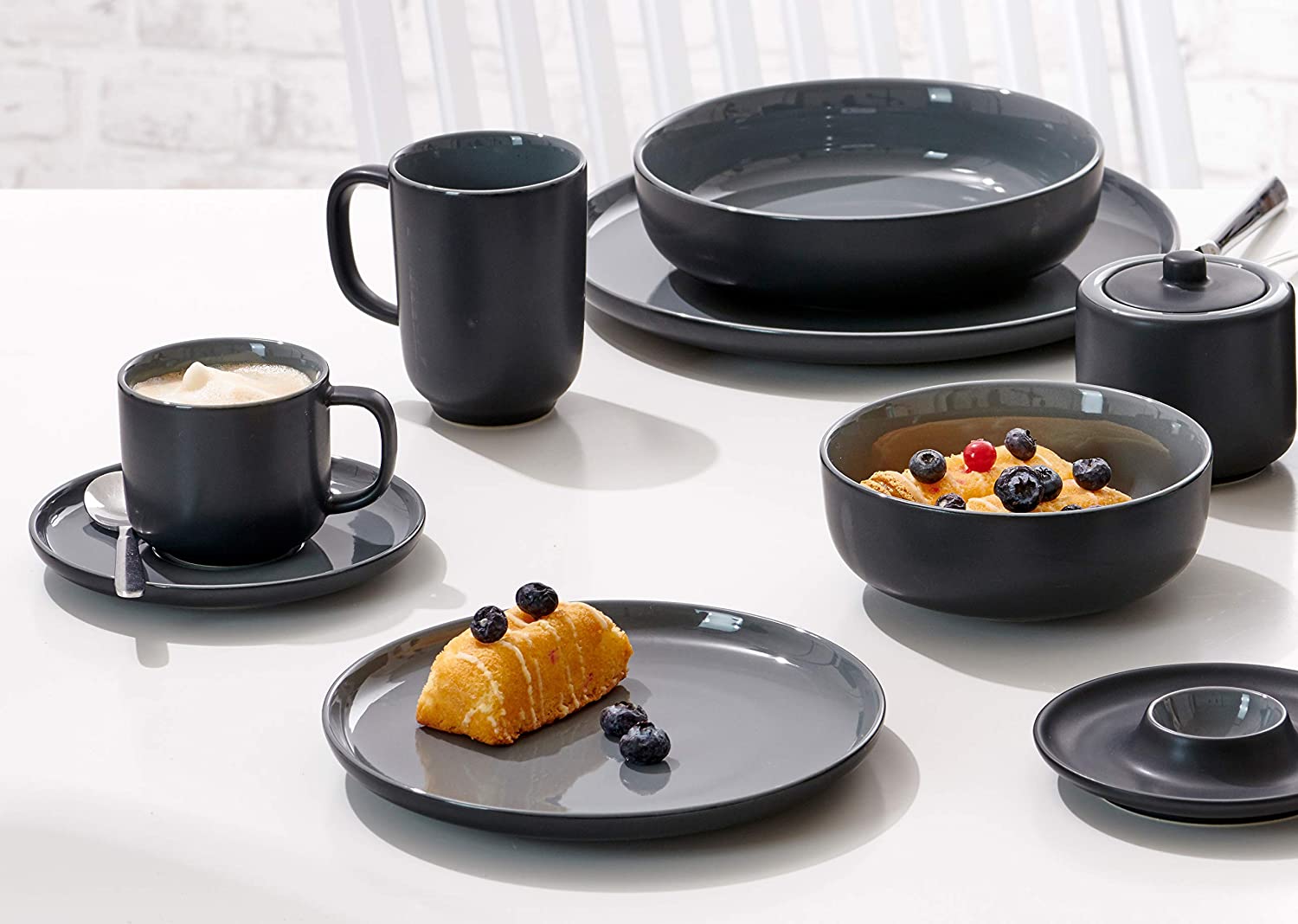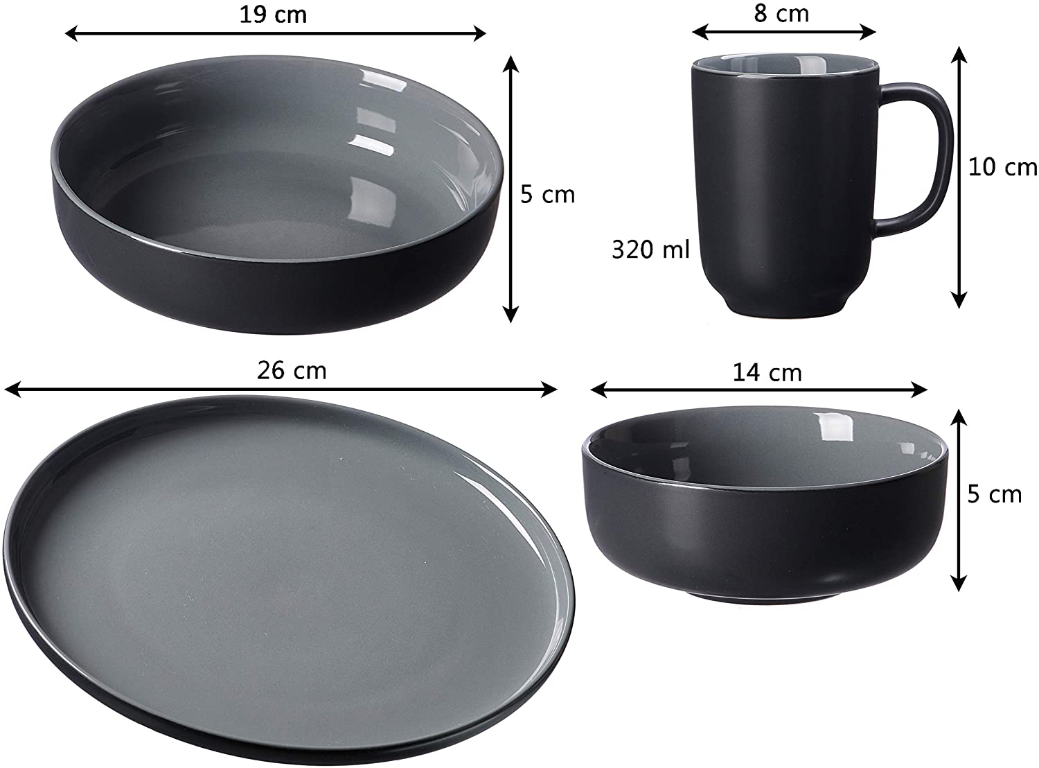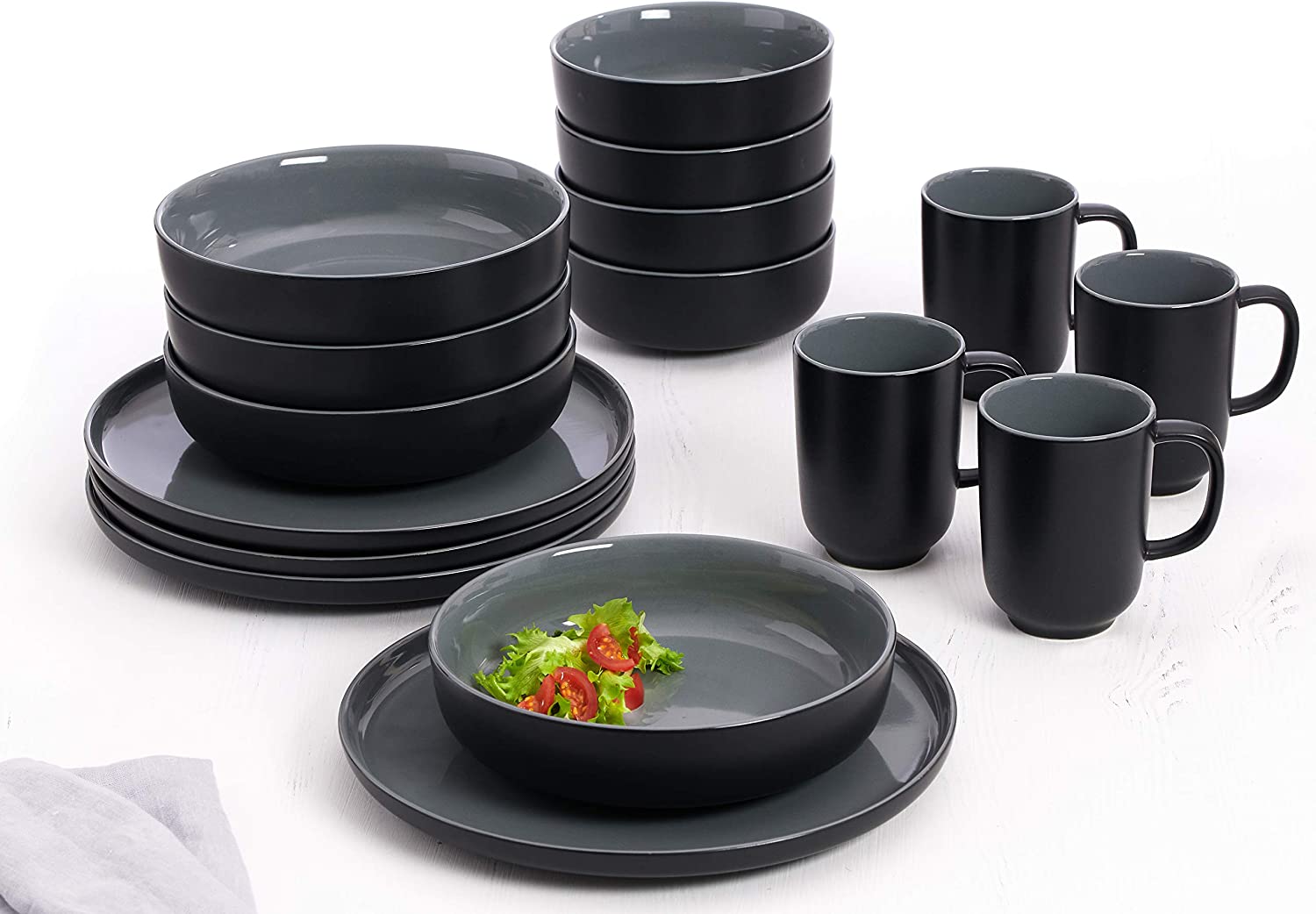 Serwis wykonany został z wysokiej jakości czarnej kamionki w stylu skandynawskim, który jest absolutnym hitem. Modny kształt oraz kolor doskonale będzie współgrać we wnętrzach nowoczesnych oraz loftowych. Wewnętrzna i górna strona naczyń jest ozdobiona błyszczącą glazurą, natomiast od strony zewnętrznej i dolnej wykończona glazurą matową. Serwisu można używać w mikrofalówce oraz myć w zmywarce.