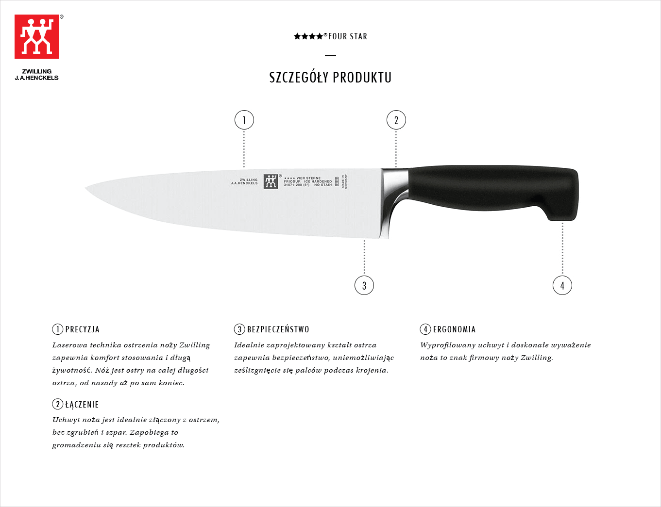 Seria noży Four Star powstała ponad 30 lat tem rewolucjonując standardy dla wysokiej jakości noży dla szefów kuchni za pomocą bezszwowego, całkowicie jednolitego uchwytu. Klasyczne arcydzieło bezpieczeństwa, ergonomii i komfortu to wciąż najlepiej sprzedająca się seria noży na całym świecie. Wykonana została z bardzo trwałego tworzywa odpornego na przebarwienia, działania kwasów spożywczych czy uderzenia. Perfekcyjnie dopracowane detale zapobiegają osadzaniu się brudu, spełniając dzięki temu normy higieniczne. Dzięki samoostrzącemu blokowi hartowane lodem ostrza tych doskonałych narzędzi będą niezmiennie ostre, zachowując perfekcyjne właściwości tnące na cały czas użytkowania