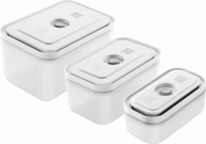 Zestaw najwyższej jakości plastikowych pojemników do prózniowego przechowywania żywności. Żywność przechowywana prózniowo pozostaje pięć razy dłużej świeża a także zachowuje swoje składniki odżywcze jak i aromaty. Po przyłożeniu pompki do zaworu i naciśnięciu przycisku w szybki i łatwy sposób pozbędziemy sie powietrza z pojemnika. Pojemniki z powodzeniem mogą być używane nie tylko w lodówce ale również w mikofalówce, zmywarce. Dodatkowo pojemniki posiadają indywidualny kod QR, który można zeskanować w darmowej aplikacji ZWILLING Culinary World dzięki czemu możemy śledzić świeżość przechowywanych produktów.