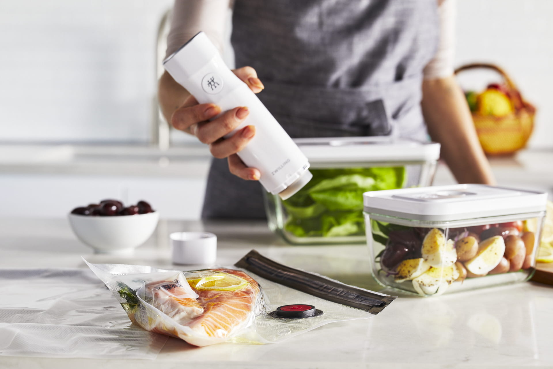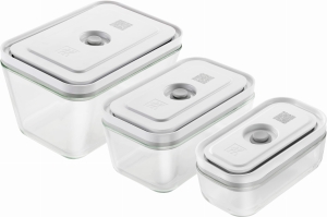 Zestaw najwyższej jakości szklanych pojemników do prózniowego przechowywania żywności. Żywność przechowywana prózniowo pozostaje pięć razy dłużej świeża a także zachowuje swoje składniki odżywcze jak i aromaty. Po przyłożeniu pompki do zaworu i naciśnięciu przycisku w szybki i łatwy sposób pozbędziemy sie powietrza z pojemnika. Pojemniki z powodzeniem mogą być używane nie tylko w lodówce ale również w mikofalówce, zmywarce czy bez pokrywki w piekarniku do 180°C. Dodatkowo pojemniki posiadają indywidualny kod QR, który można zeskanować w darmowej aplikacji ZWILLING Culinary World dzięki czemu możemy śledzić świeżość przechowywanych produktów.
